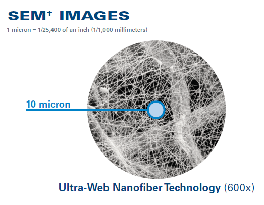 Proven and proprietary Ultra-Web® filter media delivers longer filter life, cleaner air and greater cost savings than other traditional filter media. It is made with an electrospinning process that produces a very fine, continuous, resilient fiber of 0.2-0.3 microns in diameter.