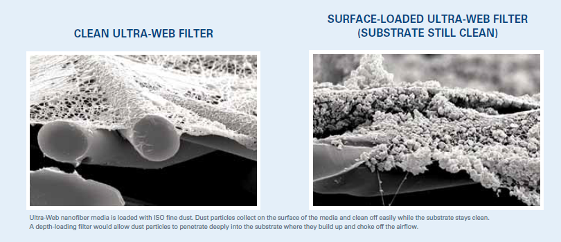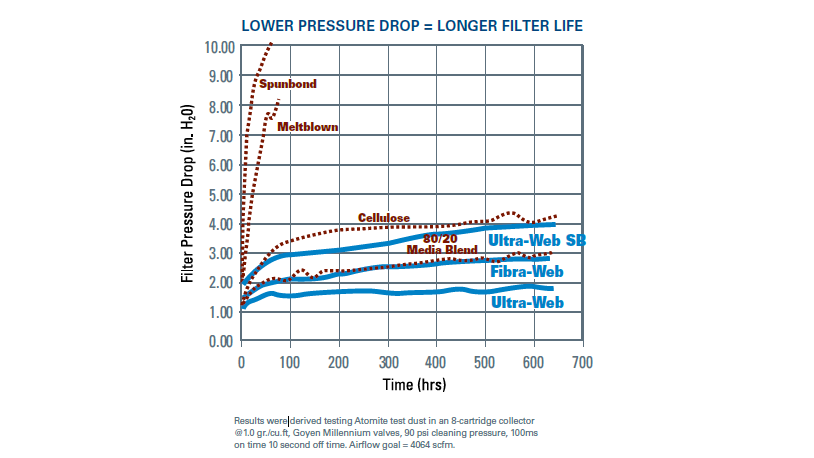 For more than three decades, Donaldson Torit has advanced our Ultra-Web technology to provide a complete line of cartridge filters that last up to twice as long as commodity cellulose and cellulose/synthetic (80/20) blend medias. Pressure drop starts high and rises quickly with depth-loading commodity filters, resulting in shorter filter life and greater energy use. Ultra-Web’s surface loading technology is scientifically proven to provide lower operating pressure drop over a longer period of time, which allows the filter to last longer while requiring less energy.