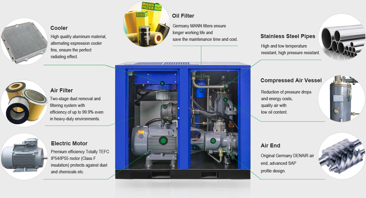 - State-of-the-art screw element, original Germany DENAIR air end, advanced SAP profile design, superior Sweden SKF element bearings.