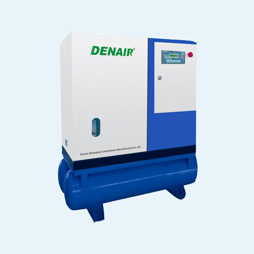 • DENAIR Tank-mounted screw air compressor is assembled with rotary screw air compressor and air storage tank.